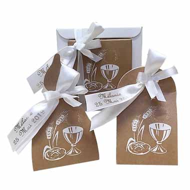 Tout d’abord un ballotin calice Caféo pour communion. Avec un ton très naturel cette boîte à dragées est parfaite ! Après bien sûr elle est garni de dragées Médicis aux amendes Lérida. Enfin elle est livré prête à offrir personnalisé avec un ruban en satin. Finalement il ne vous reste qu’a déposer ce ballotin calice Caféo sur la table de cérémonie